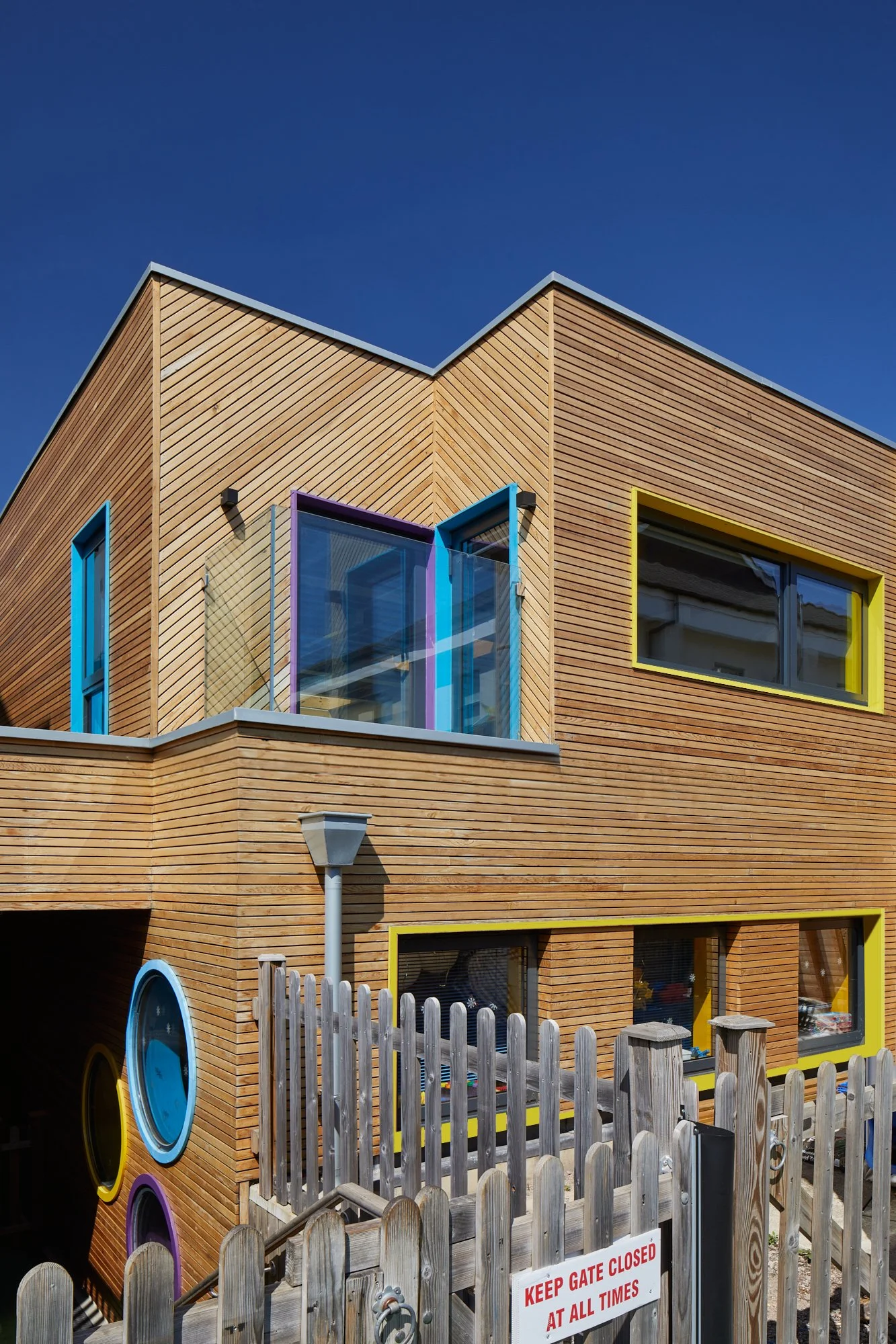 Internally, the structural strategy is expressed rather than concealed: a timber frame paired with exposed steel members establishes a clear tectonic rhythm, with suspended linear lighting integrated between structural lines. Pre-finished board linings provide a resilient and adaptable internal envelope, capable of accommodating the everyday artefacts of play, from Blu Tack to tape and crayons, without compromising longevity.