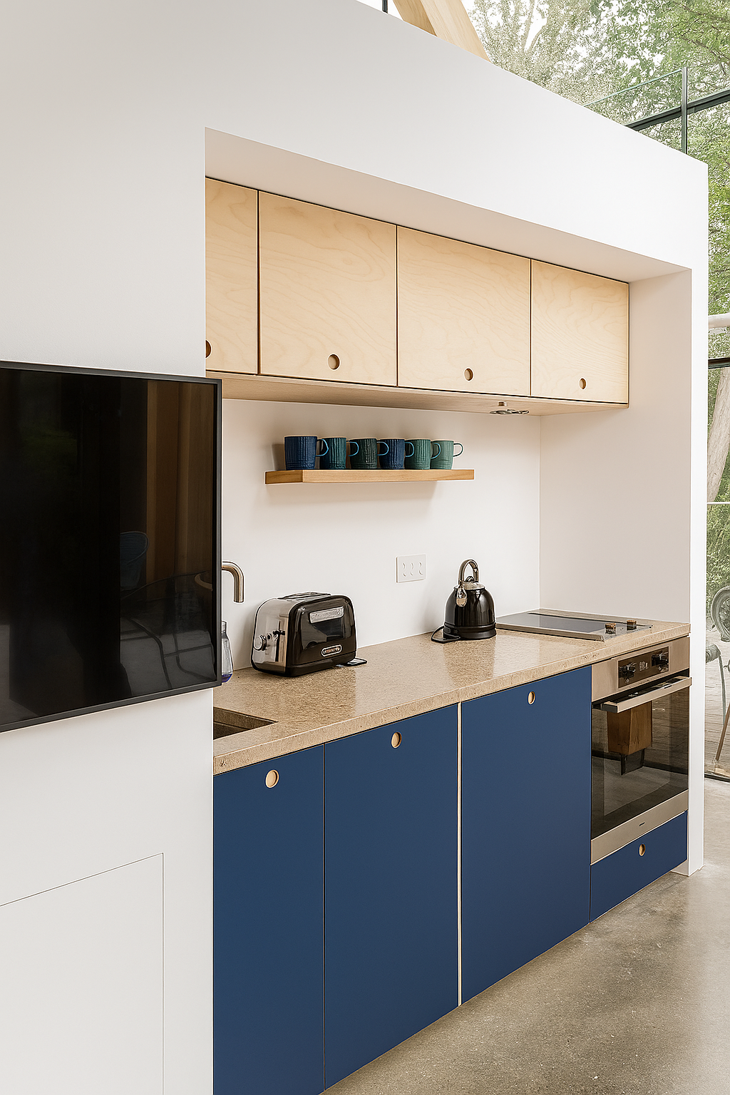 Designed to cater to a range of activities, the cabin functions as a yoga studio, study, playroom, or general hangout spot, particularly for young adults. A small tap and facilities for tea-making enhance its utility and a cast-in-situ concrete worktop adds a tactile, sculptural element while offering practical durability.