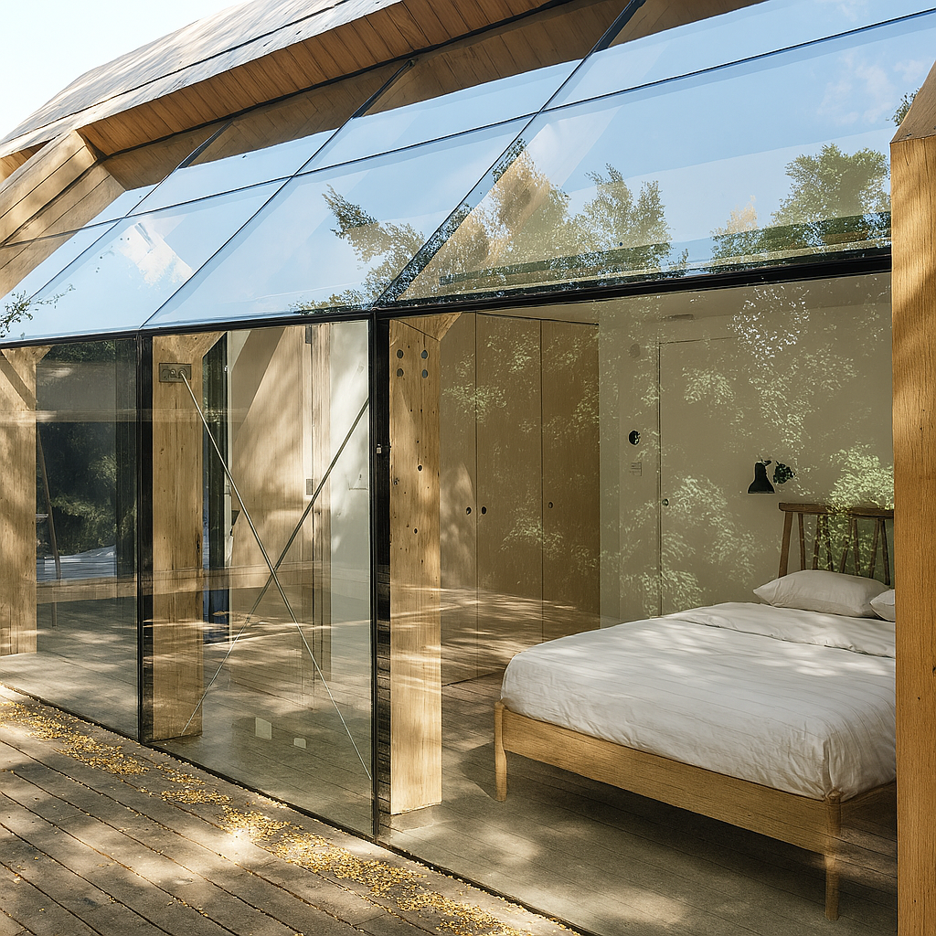 A minimal glass curtain wall spans the rear of the cabin, allowing unobstructed views of the lush greenery and enhancing the sense of being in the treetops. This integration of glass and wood creates a space that feels open yet grounded, blending seamlessly with its surroundings.