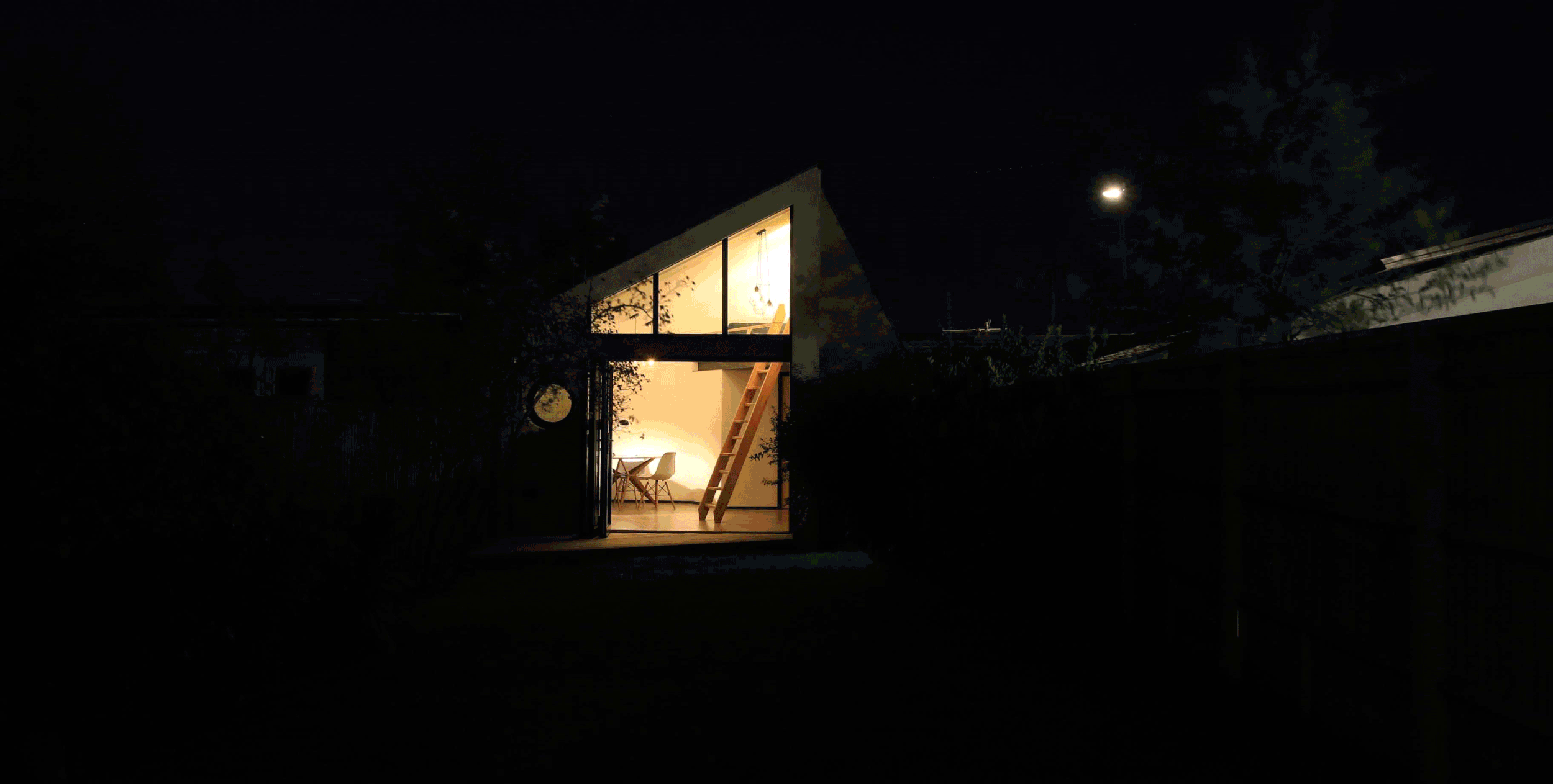 A simple, light-filled garden studio designed for working from home while creating a calm backdrop to the landscape. By day, it serves as a home workspace and at night, it glows softly to become a lantern within the garden.