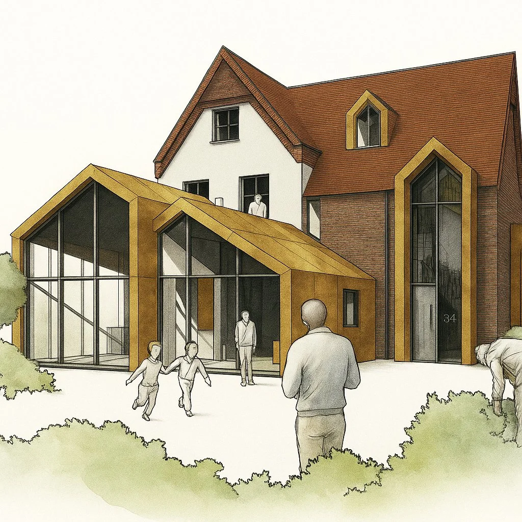 Soon to start on site and located within the Wimbledon North Conservation Area, this project is a comprehensive renovation and extension of a family home influenced by the Arts and Crafts movement. The proposal replaces a 1948 half-storey side addition with a new three-storey volume that closely follows the original massing and geometry, finished in red brick to complement the historic detailing. Corbelling, dentil courses, and gable-end brickwork are preserved and extended as a respectful continuation of the original architectural language.