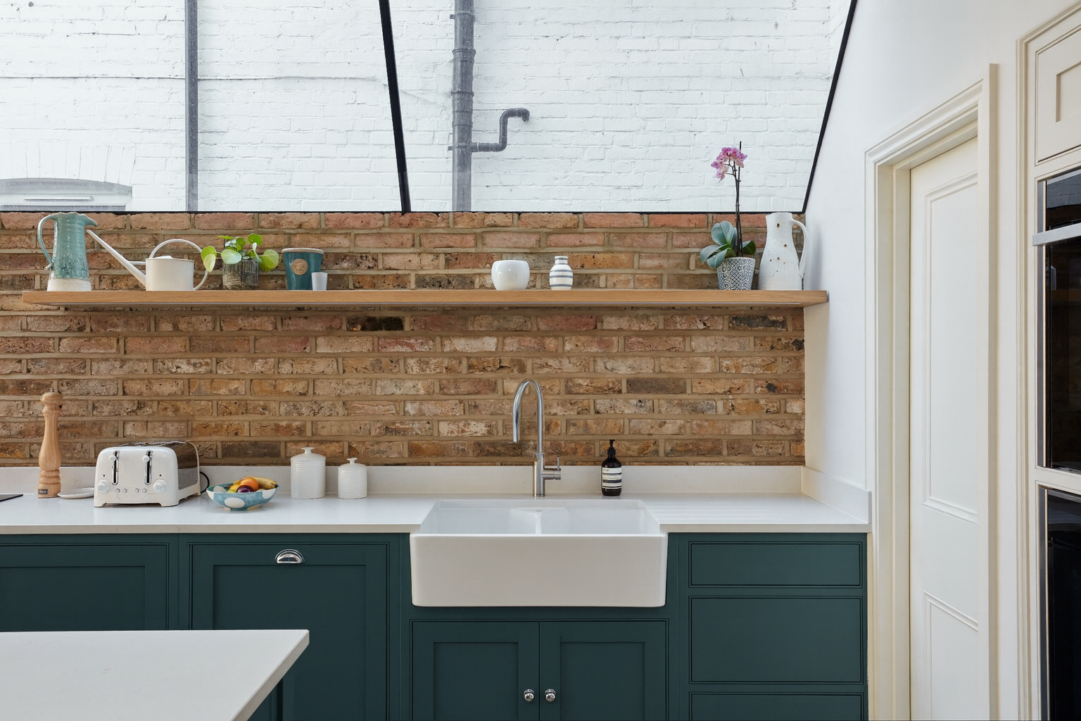 The kitchen forms the calm, crafted heart of the home where robust materials and precise detailing are brought together with clarity and intent. It sits against a backdrop of exposed brickwork and soft lime-washed flooring. Designed to feel both enduring and effortlessly lived-in. The minimal spine of glass, set at a steep pitch lends a rhythm to the space.